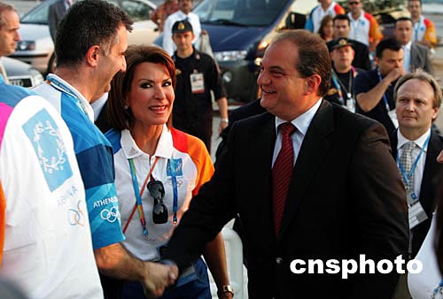 當(dāng)?shù)貢r(shí)間8月3日晚,希臘總理在組委會(huì)要員陪同下視察雅典奧運(yùn)會(huì)賽場(chǎng),并慰問志愿服務(wù)者。中新社記者:任晨鳴