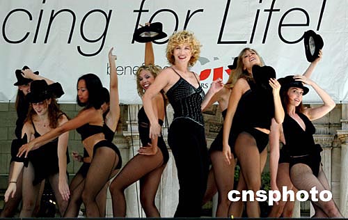 美東時(shí)間八月五日中午,紐約市中心布萊恩特公園內(nèi)舉辦《為生命起舞》的義演活動(dòng),數(shù)十位百老匯藝員載歌載舞,為艾滋病患者募捐,支持他們?cè)谏鐣?huì)生活中繼續(xù)獲得平等權(quán)利。圖為費(fèi)麗莎·芬利(Felicia Finley)(中)引領(lǐng)舞者,表演《用強(qiáng)勁的音符打動(dòng)我》。作者:陳建