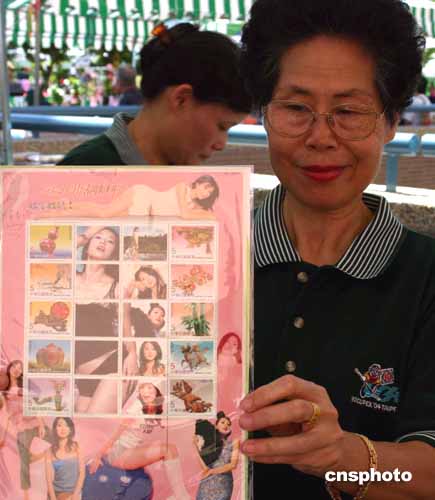 臺(tái)灣第一名模林志玲的個(gè)人化郵票八月六日亮相臺(tái)北郵展,二千五百張郵票很快銷售一空。圖為一名郵局工作人員展示林志玲個(gè)人郵票。中新社記者:董會(huì)峰