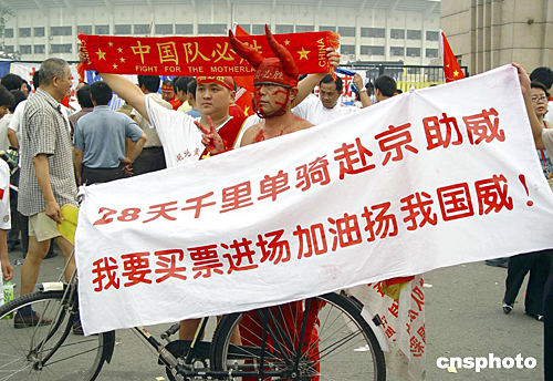 走在沮喪球迷的隊伍中,心情難免不好。這時從對面跌跌撞撞地走來一位年輕的中國球迷,用沙啞的嗓音不停地唱著《歌唱祖國》?吹贸,也許是失敗的打擊太大,他已經有些神志不清了,身邊的女友眼含淚水,默默地陪在他身邊。許多經過的女球迷也已經眼眶濕潤。