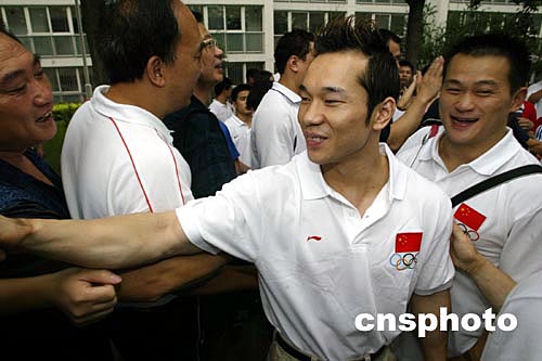 8月8日,中國奧運(yùn)軍團(tuán)齊聚北京出征2004雅典奧運(yùn)會,中國舉重隊隊員樂茂盛(右二)和張國政(右一)在中國國家體育總局訓(xùn)練局和隊友話別。中新社記者:盛佳鵬