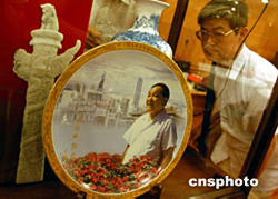 8月8日,由鄧小平夫人、88歲高齡的卓琳親筆題字“永遠的懷念”的鄧小平紀念瓷,在剛開業(yè)的北京保利至尊寶禮畫廊首發(fā),紀念瓷限量發(fā)行2004套,每套四件,包括:“世紀偉人鄧小平”高檔新彩瓷盤像、“品德風范萬年青”青花斗彩松鶴瓶、“東方風來滿園春”彩繪花卉圓盤、“三陽開泰映神州”雙龍高溫顏色釉月光瓶。中新社記者:張宇