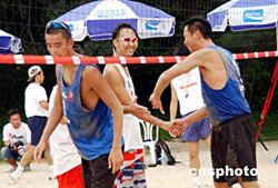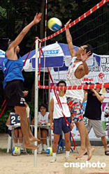由香港排球總會(huì)、康樂及文化事務(wù)署及Bolle合辦的“香港沙灘排球錦標(biāo)賽2004”于8月8日在黃金海岸舉行,進(jìn)入男子組總決賽的選手周國(guó)偉、吳景鴻戰(zhàn)勝對(duì)手獲得冠軍。者:洪少葵