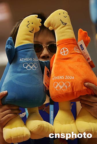 (當(dāng)?shù)貢r(shí)間)二○○四年八月八日,雅典奧運(yùn)吉祥物“雅典娜”和“費(fèi)沃斯”吸引前來采訪的記者。據(jù)悉,這種精致可愛的卡通絨毛玩具由中國(guó)制造,價(jià)格由二點(diǎn)五歐元至十幾歐元不等。中新社記者:毛建軍
