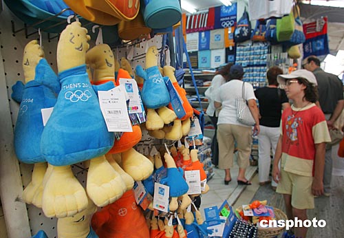 雅典奧運會開幕在即,雅典街頭的旅游商店正在熱銷奧運會的吉祥物毛絨玩具。這些毛絨玩具的產(chǎn)地是中國。中新社記者:張煒