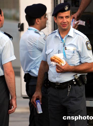 當(dāng)?shù)貢r(shí)間八月九日中午,幾名參與雅典奧運(yùn)會(huì)安保的希臘警察依次領(lǐng)取簡(jiǎn)易的工作午餐。中新社記者:任晨鳴