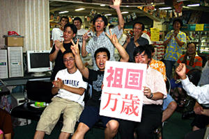 這次活動是由大阪的中文報紙《關(guān)西華文時報》策劃組織的,地點(diǎn)在市中心的中華城,數(shù)十名中國人球迷在鮮艷的五星紅旗下,高舉“祖國萬歲”的標(biāo)語牌,邊觀看大屏幕電視,邊為中國隊吶喊助威的。日本有名的電視臺每日電視臺專門派出了一個攝制小組進(jìn)行現(xiàn)場采訪。