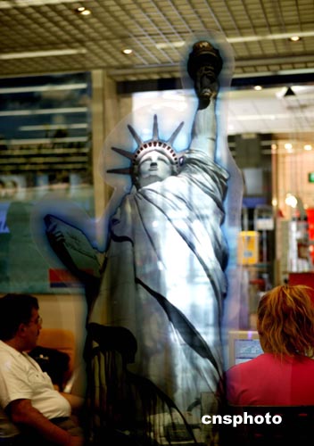 希臘雅典一家旅行社八月九日掛出美國(guó)自由女神畫(huà),奧運(yùn)會(huì)期間該社將為各國(guó)游客提供豐富的旅游服務(wù)。中新社記者:王瑤