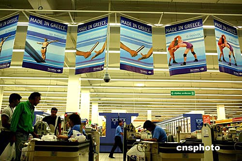 奧運(yùn)會(huì)開幕在即,希臘雅典的商家們借奧運(yùn)東風(fēng)開展促銷,家樂福超市里掛滿體育彩旗,宣傳推介當(dāng)?shù)爻霎a(chǎn)的日用品。中新社記者:王瑤
