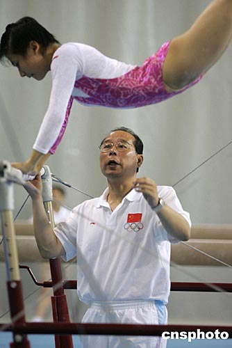 中國(guó)女子體操隊(duì)隊(duì)員王湉湉在雅典奧運(yùn)會(huì)體操館進(jìn)行高低杠賽前訓(xùn)練。中新社記者:毛建軍