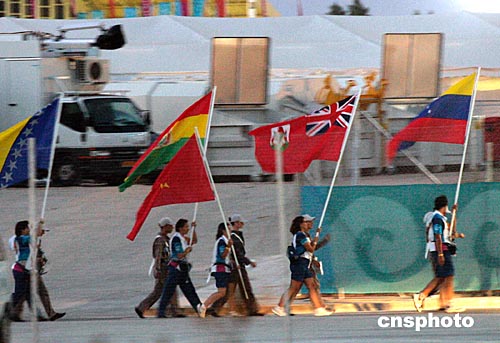 雅典時(shí)間8月10日晚,最后一次奧運(yùn)開幕式彩排在雅典主體育場舉行。圖為旗手高舉各參賽代表團(tuán)旗幟列隊(duì)進(jìn)入體育場。中新社記者:張煒