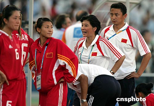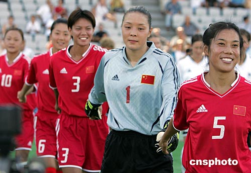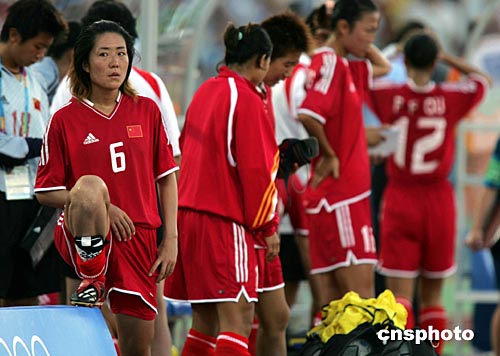 在奧運(yùn)會(huì)女足小組賽中,中國(guó)女足排出了老中青相結(jié)合的433陣型。第12分鐘,德國(guó)隊(duì)2號(hào)施特格曼大腳斜傳到禁區(qū)內(nèi),世界杯金靴普林茨搶躍起點(diǎn)頭球頂門,皮球應(yīng)聲入網(wǎng),德國(guó)隊(duì)1比0領(lǐng)先。落后的中國(guó)女足多次發(fā)動(dòng)長(zhǎng)傳,但在高空優(yōu)勢(shì)明顯的德國(guó)隊(duì)面前沒有任何用處,反而被普林茨遠(yuǎn)門柱俯身沖頂將比分改為2比0。