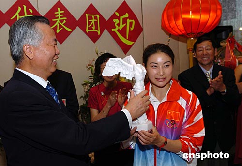 中國(guó)跳水隊(duì)靚女郭晶晶獲中國(guó)駐希臘大使唐振琪贈(zèng)送“勝利女神”,寓意旗開得勝。作者:陳佳