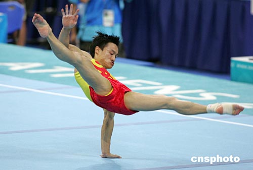中國(guó)男子體操隊(duì)于當(dāng)?shù)貢r(shí)間八月十一日晚在雅典奧運(yùn)體操比賽館與德國(guó)、日本、烏克蘭隊(duì)進(jìn)行集體合練,圖為楊威在自由體操訓(xùn)練中。中新社記者:毛建軍