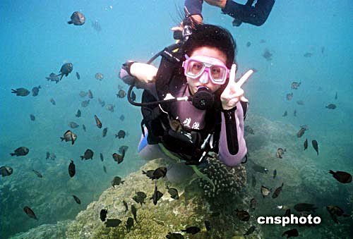 在三亞市,花上三百元左右就能在亞龍灣海中世界潛水觀光,這名中學(xué)生潛水正玩得開(kāi)心。據(jù)悉,今年七月下旬以來(lái),夏令營(yíng)、學(xué)生團(tuán)、親子游、修學(xué)游等各種主題旅游紛紛推出,每天有五六百人的師生團(tuán)包機(jī)來(lái)海南,使海南暑期游再現(xiàn)火爆。作者:蔣聚榮