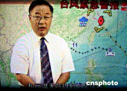 中國氣象局局長(zhǎng)秦大河八月十二日在中央電視臺(tái)黃金時(shí)間的天氣預(yù)報(bào)節(jié)目上首次亮相,發(fā)布中國大部分地區(qū)即將出現(xiàn)臺(tái)風(fēng)和暴雨的緊急警報(bào),同時(shí)顯示紅色的中國地質(zhì)災(zāi)害警報(bào)。中新社記者:賈國榮