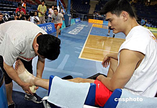 “姚明來了!”一聲聲欣喜的驚呼后,各路老記從不同的方向奔向已在休息長椅上坐下的姚明。姚明在隊醫(yī)的協(xié)助下往腳上裹纏紗布的畫面被無數(shù)的照相機(jī)和攝影機(jī)攝入鏡頭。