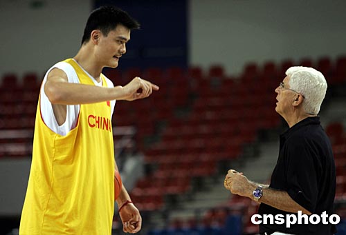 將要在開幕式上擔(dān)任中國奧運代表團旗手的姚明在訓(xùn)練結(jié)束后向媒體表示:會格外珍稀這個神圣的榮譽,將國旗舉得高高的。作者:任晨鳴  將要在開幕式上擔(dān)任中國代表團旗手的姚明在訓(xùn)練中與主教練交流。作者:任晨鳴