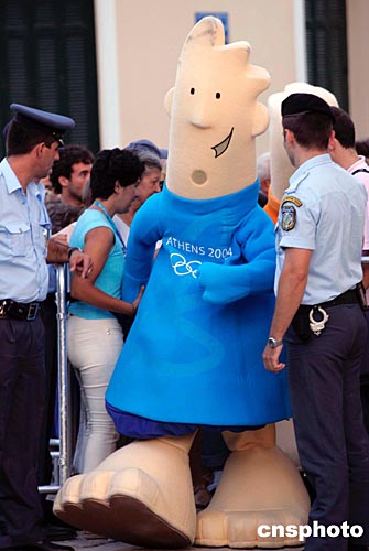 當(dāng)?shù)貢r間8月12日傍晚,奧運火炬即將到達雅典衛(wèi)城。雅典市民夾道歡迎。奧運吉祥物在警察的護衛(wèi)下來到現(xiàn)場。中新社記者:張煒