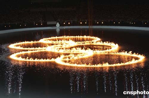 當(dāng)?shù)貢r間八月十三日晚,第二十八屆奧運會在希臘雅典開幕。圖為開幕式上奧運五環(huán)標(biāo)志從“愛琴!敝猩。中新社記者:毛建軍
