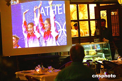 八月十四日晚,中國跳水健兒郭晶晶、吳敏霞為中國隊獲得一枚奧運金牌。圖為雅典市民在一家意大利式餐廳里關注這一賽事的電視直播節(jié)目。中新社記者:王瑤