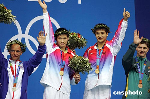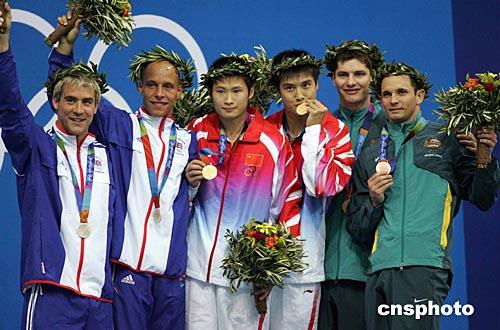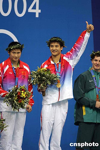 當(dāng)?shù)貢r(shí)間八月十四日晚,中國跳水隊(duì)田亮、楊景輝在雅典奧運(yùn)跳水館獲得男子雙人十米跳臺金牌。中新社記者:毛建軍