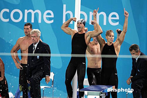當?shù)貢r間八月十五日晚,在雅典舉行的第二十八屆奧運會游泳比賽中,南非選手以三分十三秒一七的成績獲得男子四乘一百米自由泳接力賽金牌。中新社記者:毛建軍