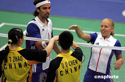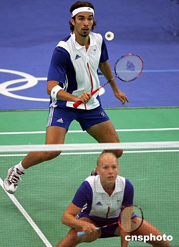 英國參加雅典奧運會羽毛球混合雙打的羅伯遜、埃姆斯,當(dāng)?shù)貢r間8月16日以2比0選手戰(zhàn)勝中國選手陳其遒、趙婷婷,進入前四名。