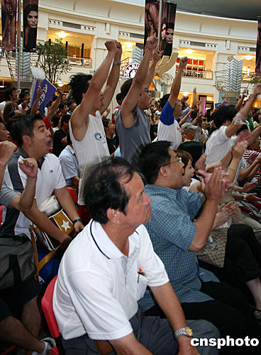 出征雅典奧運(yùn)會(huì)的中國(guó)臺(tái)北棒球隊(duì)16日下午以3:0戰(zhàn)勝澳大利亞隊(duì)。圖為狂熱的棒球迷聚集臺(tái)北101大樓4樓,收看大屏幕直播。中新社記者:董會(huì)峰