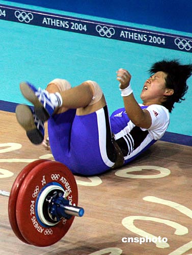 雅典當(dāng)?shù)貢r間8月16日下午,一名選手在奧運女子58公斤級舉重比賽中失利。中新社記者:張煒