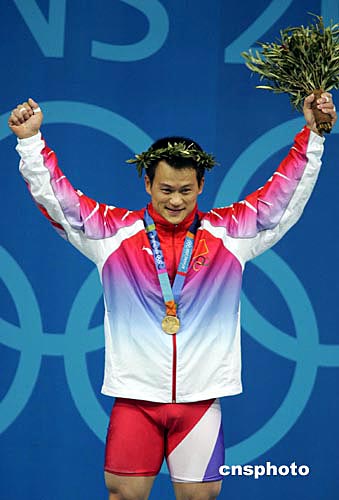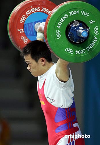 希臘當(dāng)?shù)貢r(shí)間八月十八日晚,中國(guó)舉重選手張國(guó)政在雅典奧運(yùn)男子六十九公斤級(jí)舉重比賽中,以三百四十七點(diǎn)五公斤的總成績(jī)獲得冠軍,為中國(guó)代表團(tuán)“舉起”第十一枚金牌。作者:毛建軍