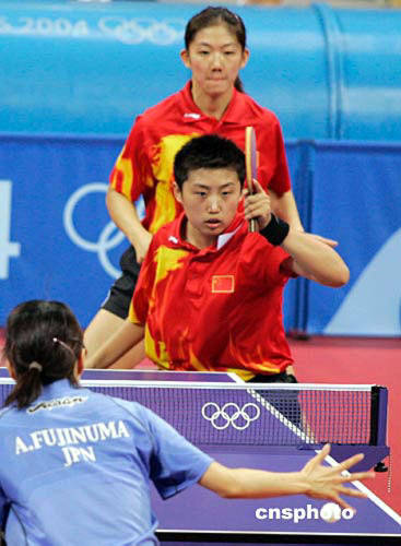 當(dāng)?shù)貢r(shí)間八月十八日,在雅典奧運(yùn)會(huì)乒乓球女雙1/4決賽中,中國(guó)選手郭躍、牛劍鋒以4:2擊敗日本選手福原愛、梅村禮,晉級(jí)四強(qiáng)。中新社記者:張煒