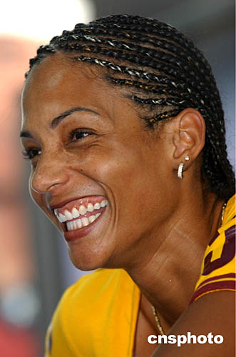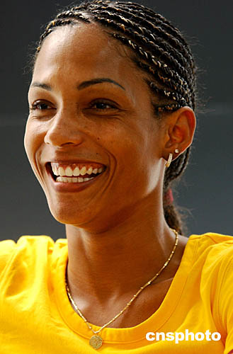 圖為法國(guó)賽跑選手Christine Arron在當(dāng)?shù)貢r(shí)間8月18日舉行新聞發(fā)布會(huì)時(shí)露出燦爛的笑容。她將在下周參加女子100米,200米和4*100米接力比賽。