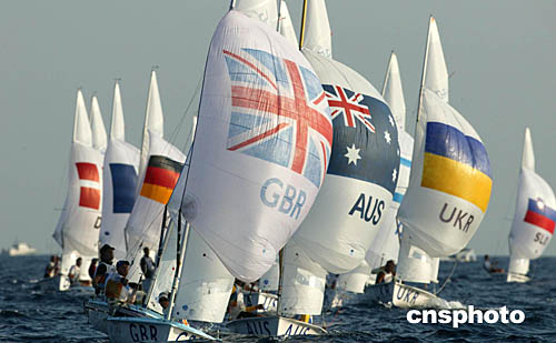 圖為在當(dāng)?shù)貢r間8月17日舉行的男子帆船帆板項目中,各參賽隊開局競爭激烈。