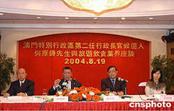 澳門特別行政區(qū)第二任行政長官候選人何厚鏵,十九日在濠景酒店與澳門旅游及飲食界代表舉行座談會,聽取業(yè)界人士在經(jīng)營旅游及飲食業(yè)中存在的問題及意見。作者:梁永強(qiáng)