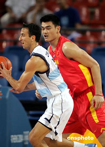 第二節(jié)開始,在阿根廷隊的全場緊逼戰(zhàn)術(shù)下,中國隊將第一節(jié)失誤的頻率進(jìn)一步加快,成全阿根廷隊打出了十七比二的高潮。至上半場結(jié)束,中國隊以二十一比四十一落后二十分。姚明僅僅得三分,五個籃板。