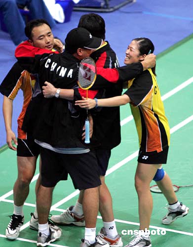 中新社雅典八月十九日電 中國羽毛球隊(duì)今天一掃前兩日男單、男雙盡墨的陰霾,張寧與張軍/高崚分別在雅典奧運(yùn)羽球女單和混雙項(xiàng)目上折桂。賽后,國際三大通訊社對(duì)中國的勝利競相點(diǎn)評(píng)。