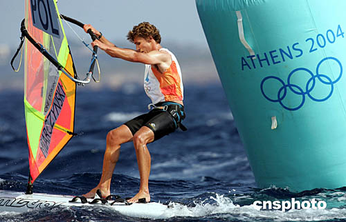 圖為波蘭選手Przemyslaw Miarczynski在當?shù)貢r間8月18日舉行的男子帆船帆板比賽中的一個鏡頭。