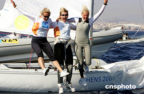 圖為英國隊(duì)在獲得今年才列入奧運(yùn)會(huì)比賽項(xiàng)目的女子龍骨船-鷹鈴級(jí)比賽冠軍后,齊聲歡躍的情景。