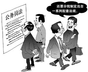 《公務(wù)員法》已進(jìn)入立法程序,2005年有望出臺(tái)。有關(guān)部門還將根據(jù)實(shí)際情況,分批制定出臺(tái)有關(guān)公務(wù)員范圍、職務(wù)職級(jí)、錄用、考核、工資、培訓(xùn)、申訴控告等一系列配套法規(guī),并研究修改公務(wù)員行政處分條例草案。