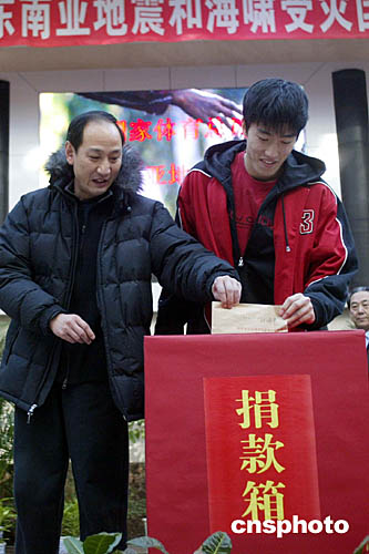 一月五日,中國(guó)國(guó)家體育總局各部門(mén)領(lǐng)導(dǎo)、職員以及各個(gè)項(xiàng)目運(yùn)動(dòng)員代表在北京國(guó)家體育總局舉行向東南亞受災(zāi)國(guó)家人民捐款活動(dòng),在奧運(yùn)會(huì)獲得一百一十米欄冠軍的劉翔(右)和他的教練孫海平在捐款箱前捐款。中新社記者:盛佳鵬