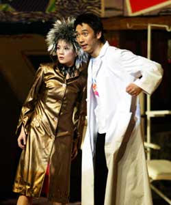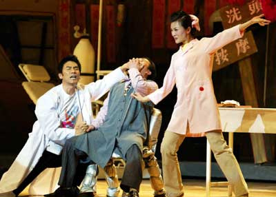 《麻花2》的舞美也是“后現(xiàn)代”風格的典范。演出一開場,3046年閃亮的舞臺和古怪的時空穿梭機便出現(xiàn)在觀眾面前,在耀眼的光芒中,2004年的“醫(yī)院”以寫實與抽象相結合的方式出現(xiàn):矮小的窩棚一樣的病房上面,陳列著巨幅“現(xiàn)代派”油畫,客廳、黑貓這些形象交錯混雜在一起,乍看上去,《麻花2》的舞臺頗像北京七二七工廠附近的酒吧。演員拿的道具也頗有象征效果:近一米長的大針管、板磚一樣的心臟起搏器……《麻花2》將怪誕二字做到極致。
