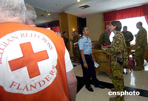 在印度尼西亞棉蘭市參加救援行動的國際救援組織和世界各地記者人數(shù)眾多,令多家星級酒店爆滿.多個(gè)救援組織在酒店設(shè)立信息交流中心商討拯救班達(dá)亞齊災(zāi)區(qū)事宜.圖為澳洲軍人與印度尼西亞軍方人員交流信息。作者:洪少葵