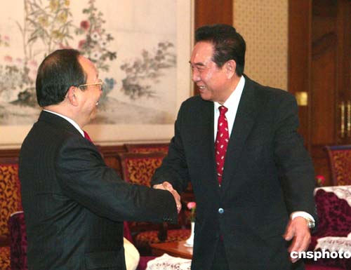 國務(wù)院臺(tái)灣事務(wù)辦公室主任陳云林,一月十日在北京會(huì)見由國民黨中央政策會(huì)執(zhí)行長曾永權(quán)(圖左)率領(lǐng)的“推動(dòng)臺(tái)商春節(jié)包機(jī)參訪團(tuán)”。中新社記者:滿會(huì)喬
