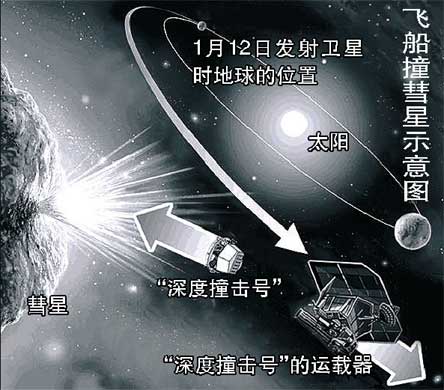 “深度撞擊號(hào)”將從佛羅里達(dá)卡納維爾角的發(fā)射中心發(fā)射升空。如果一切順利,重達(dá)約363公斤的銅質(zhì)撞擊器提前24小時(shí)與“深度撞擊號(hào)”母船分離,并在7月4日穿越“坦普爾1號(hào)”的彗尾、彗發(fā),以每小時(shí)3.7萬(wàn)公里的速度直接命中直徑6公里的“坦普爾1號(hào)”彗星彗核。撞擊產(chǎn)生的威力相當(dāng)于4.5噸TNT炸彈爆炸,即便是發(fā)生在距地球1.3億公里的遠(yuǎn)層外太空,也能在地球上觀察到。