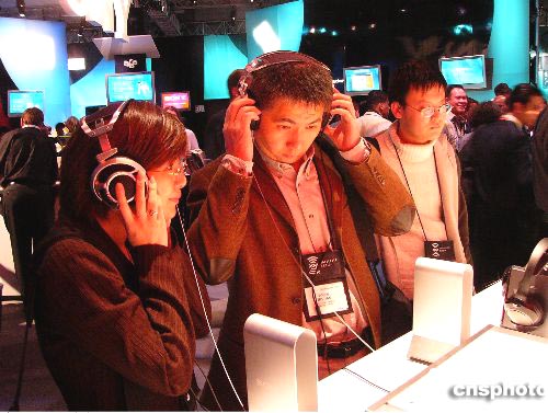一月六日在美國(guó)拉斯維加斯開幕的二00五國(guó)際消費(fèi)電子展,吸引世界各地的商家及消費(fèi)者。圖為來自中國(guó)大陸的參觀者在索尼展臺(tái)前試聽音響。作者:潘旭臨