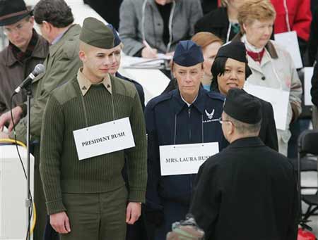 兩名年輕的美軍戰(zhàn)士分別掛著寫有“總統(tǒng)布什”和“第一夫人勞拉”的牌子,在預演中扮演總統(tǒng)夫婦。