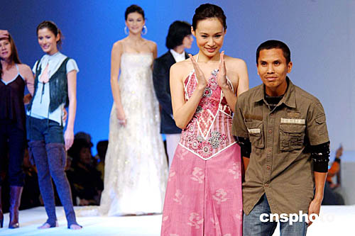 | 1月20日,在“香港時(shí)裝節(jié)秋冬系列”及“香港國(guó)際時(shí)尚薈萃”上,舉辦一場(chǎng)國(guó)際時(shí)裝設(shè)計(jì)師表演,圖為印度尼西亞時(shí)裝設(shè)計(jì)師A.Sofiyulloh與名模楊崢登臺(tái)謝幕。作者:洪少葵