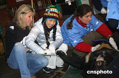 一月二十日,“拯救黑熊”愛心大使、香港藝人莫文蔚再次到訪亞洲動(dòng)物基金位于成都的黑熊救護(hù)中心,正式認(rèn)養(yǎng)一頭剛被四川省林業(yè)廳解救的亞洲黑熊,并為這頭幸運(yùn)的黑熊命名為“寶貝”。圖為莫文蔚(中)與亞洲動(dòng)物基金創(chuàng)辦人及行政總監(jiān)謝羅便臣女士(左一)一起為這頭黑熊做身體檢查。作者:魯彥