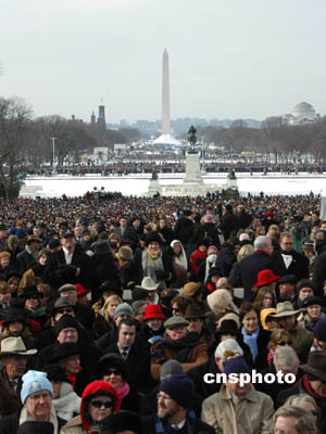 當(dāng)天華盛頓雪后初晴,但天寒地凍,數(shù)十萬(wàn)人聚集在從國(guó)會(huì)山到華盛頓紀(jì)念碑的街道和草坪上,參加布什的就職典禮。他們當(dāng)中既有為布什連任歡呼者,也有不滿(mǎn)布什政府的抗議示威者。